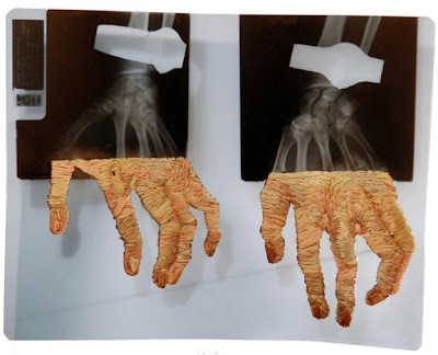 Philadelphia-based artist Matthew Cox swirls together contradictions in his latest series, Embroidered X-Rays. Weaving embroidery thread into plastic, skeletal slides, Cox’s collection provides an odd juxtaposition, both visually and conceptually, the vibrant colors and familiar characters setting a playful mood while the X-rays remain cold and clinical.